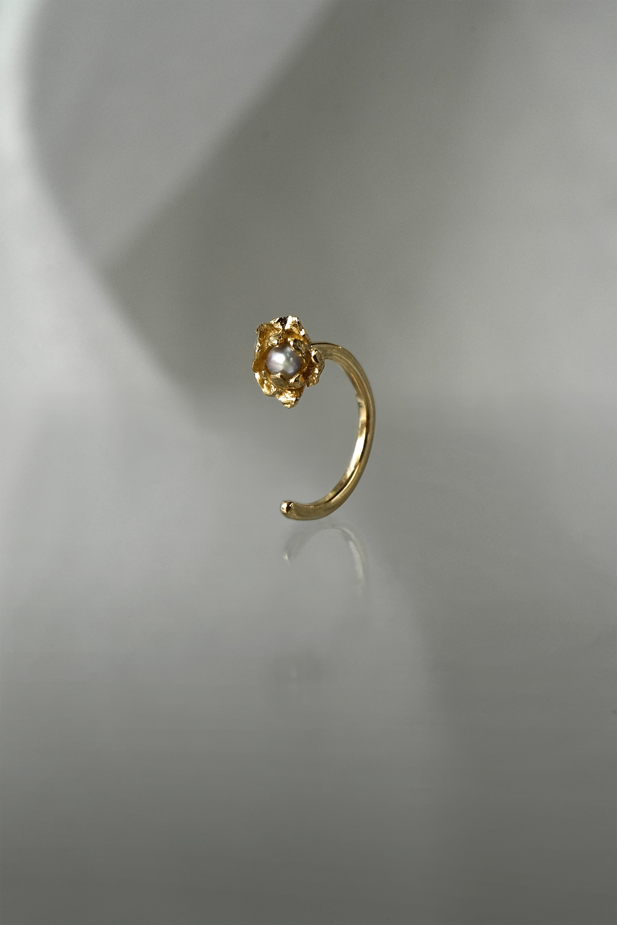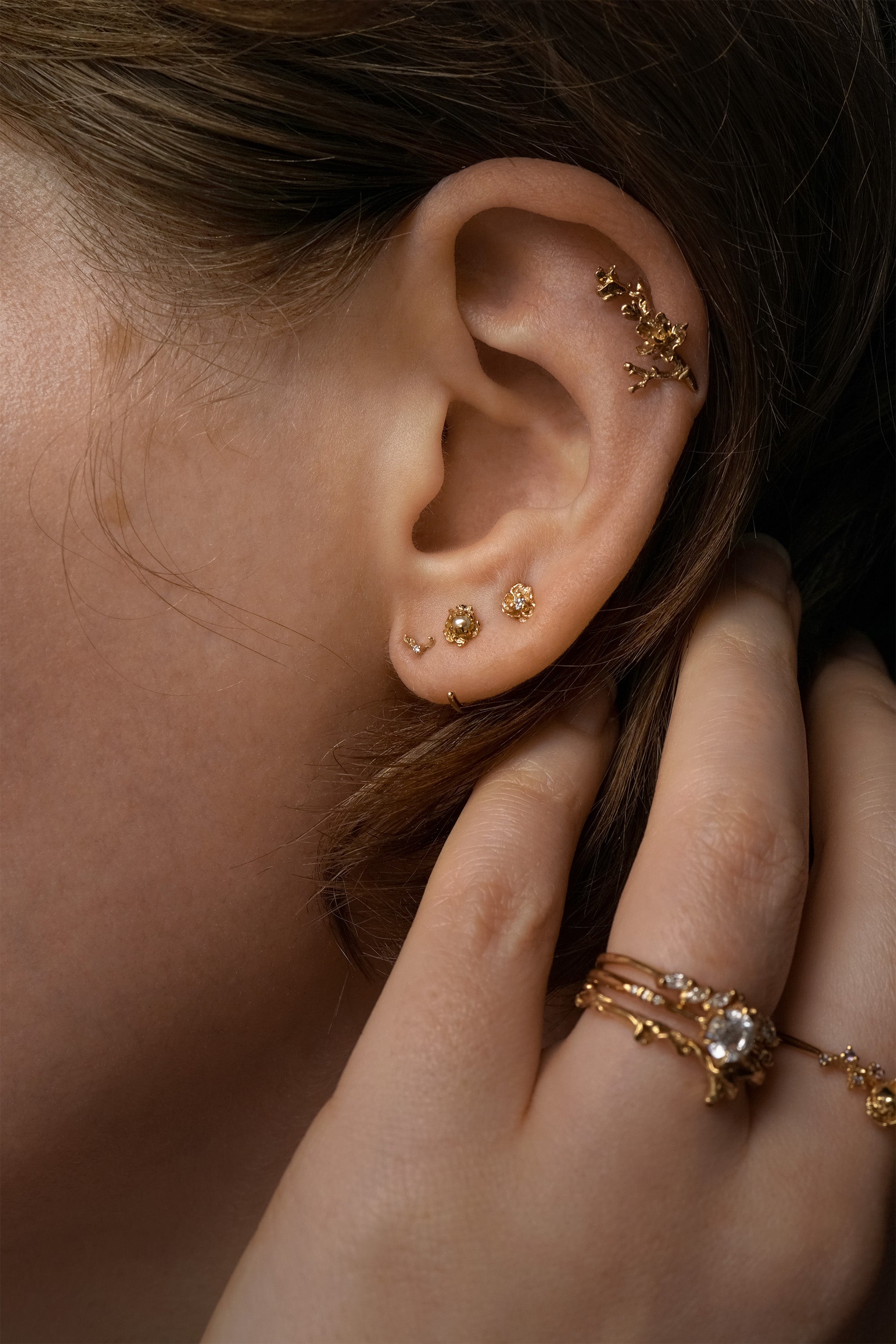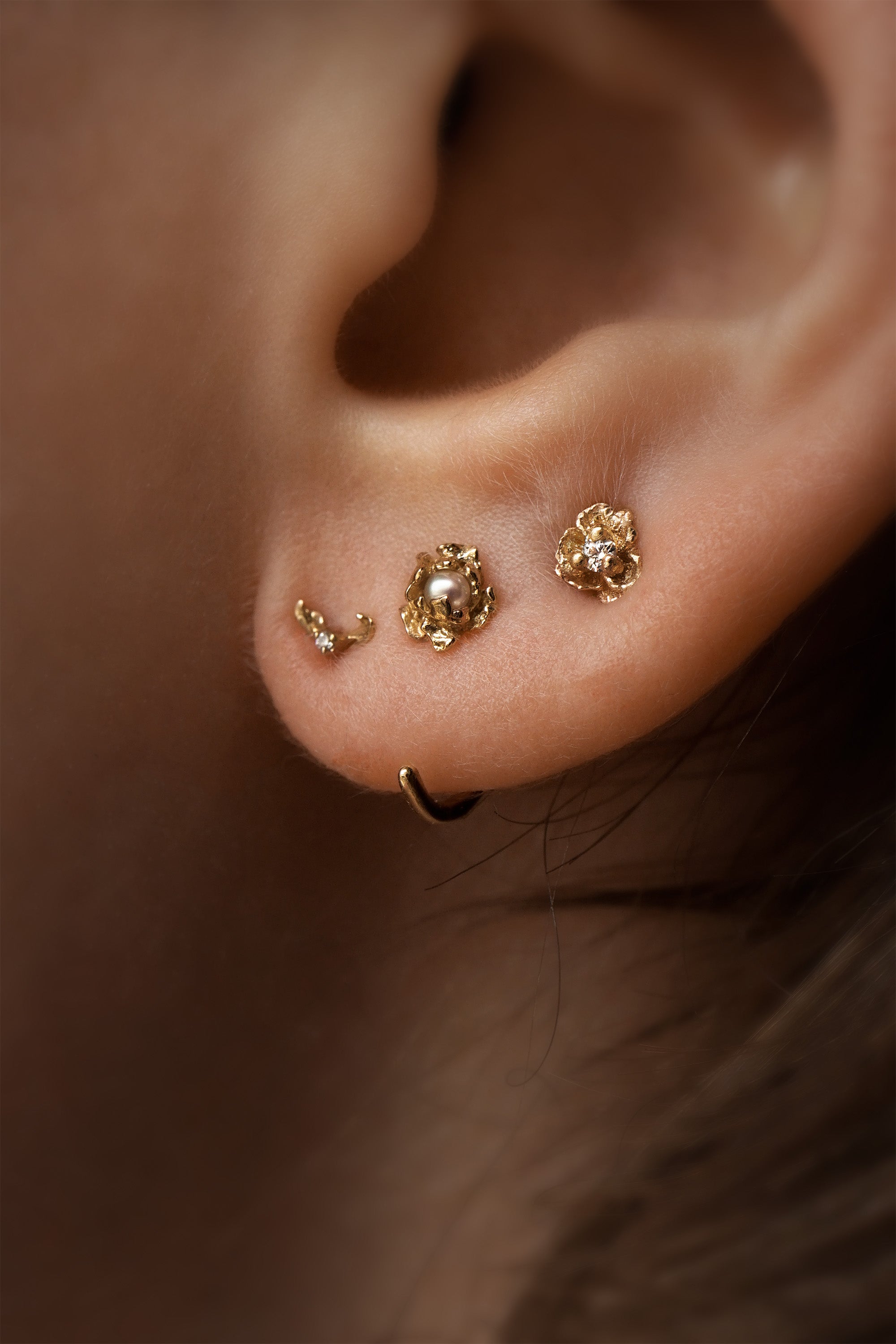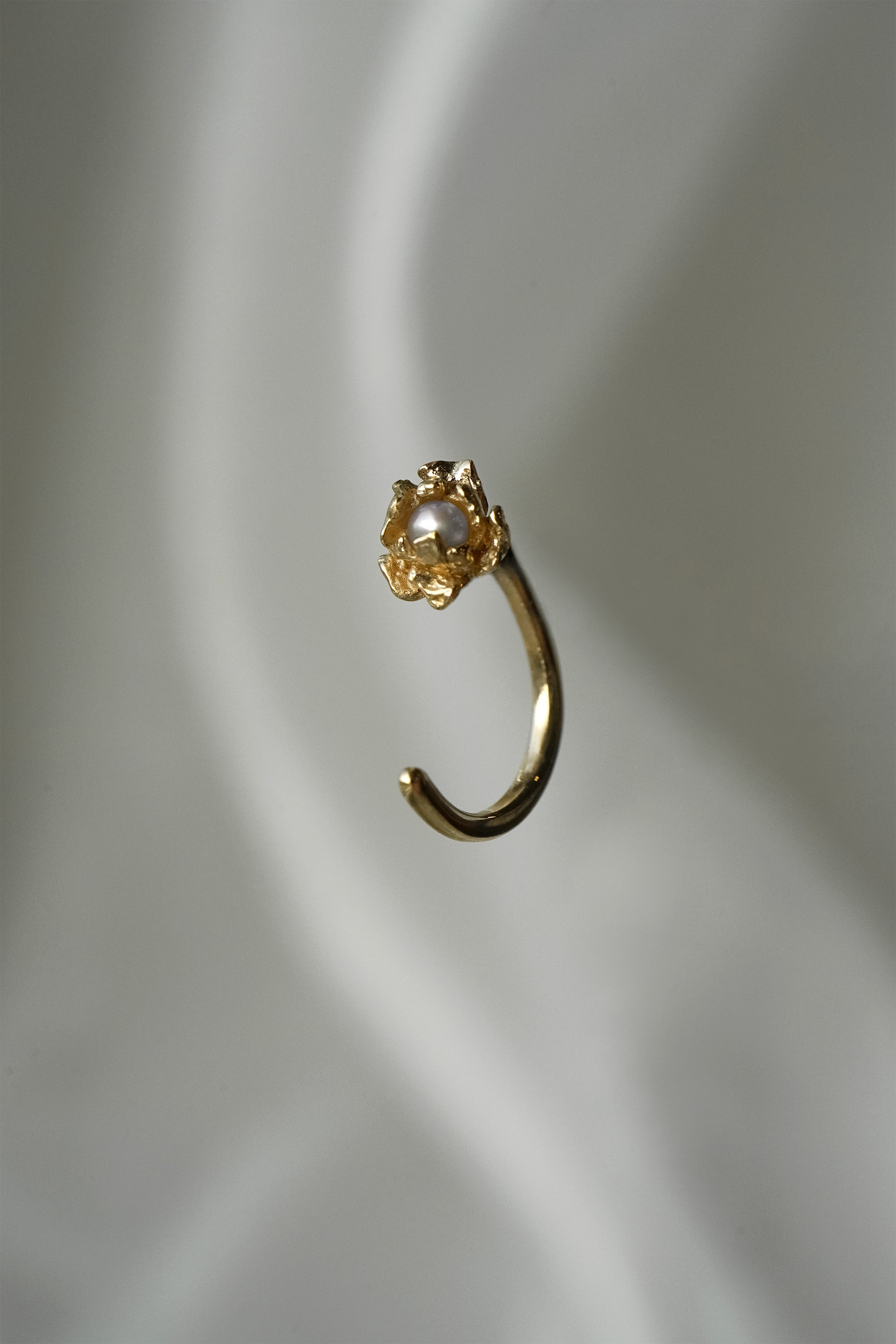 Drops of pearl moonlight, nestled in the most ethereal blooms and plucked from a dream. Hand-carved, with intricately layered unfurling petals of gold. An enchanted heirloom, wrapped around your lobes. She works beautifully when combined with other piercings.