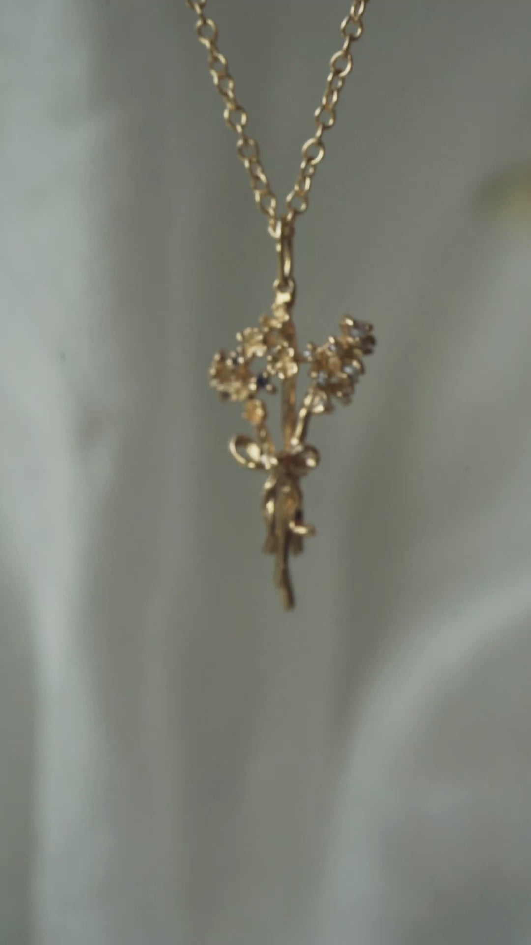 Your bouquet will be custom arranged by us on your pendant, using the flowers you select (ie. Tulip, Baby's Breath, Wisteria), before being cast in immortal, glowing gold. We may reorient the blooms, deconstruct, or slightly reshape them to achieve a balanced and one-of-a-kind floral arrangement. For Bouquets tied up with a bow, the bow placement may vary (arranged in the middle of the stems, but may be placed slightly to the side, or centred straight on).