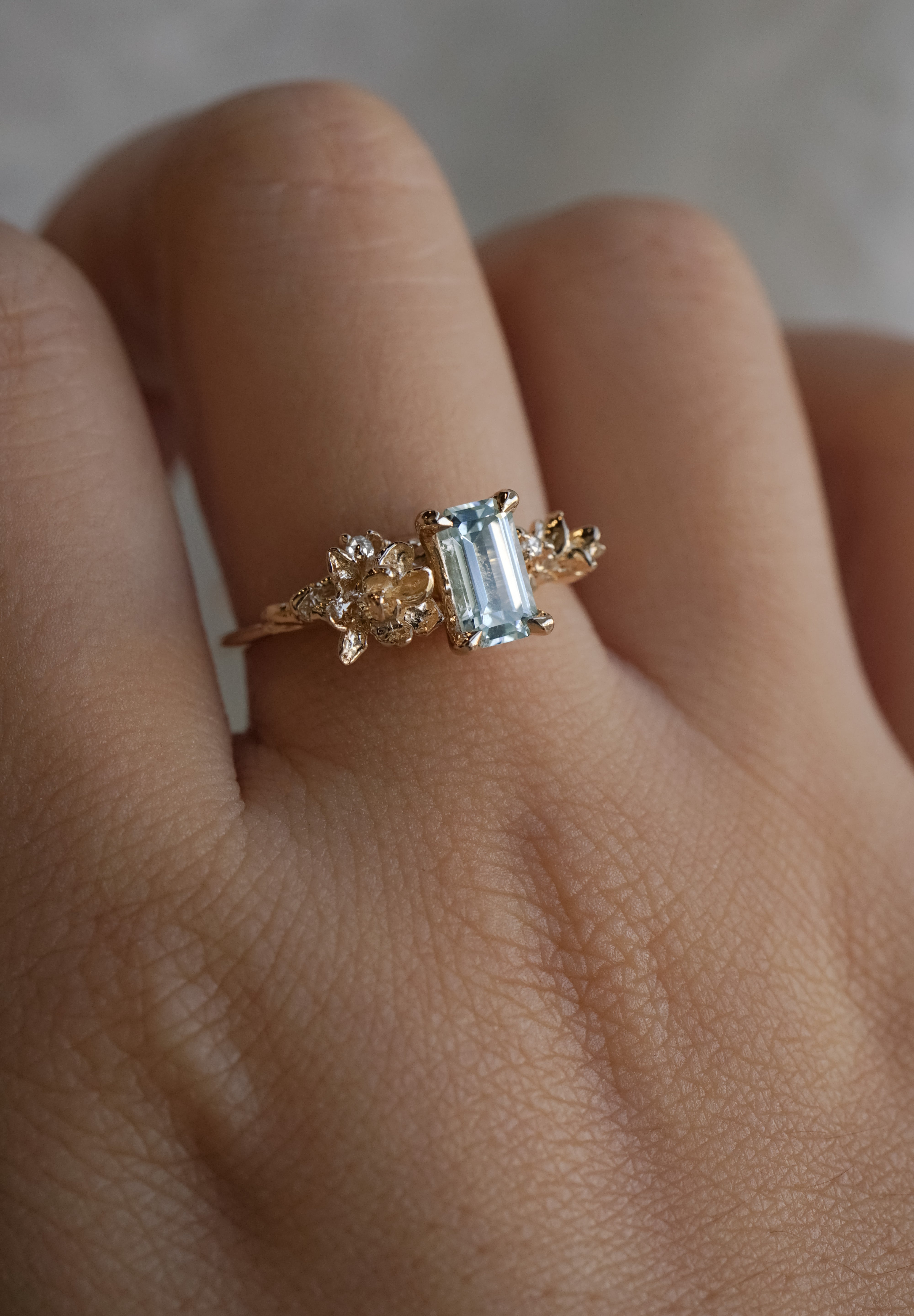 A portal of clear skies reflected through a pond garden in full bloom. Nestled against sculptural magnolia petals, pastel blues and greens drift through the mirror facets of the glowing emerald cut sapphire at the centre of this Asrai Garden Ring.
