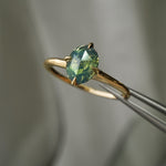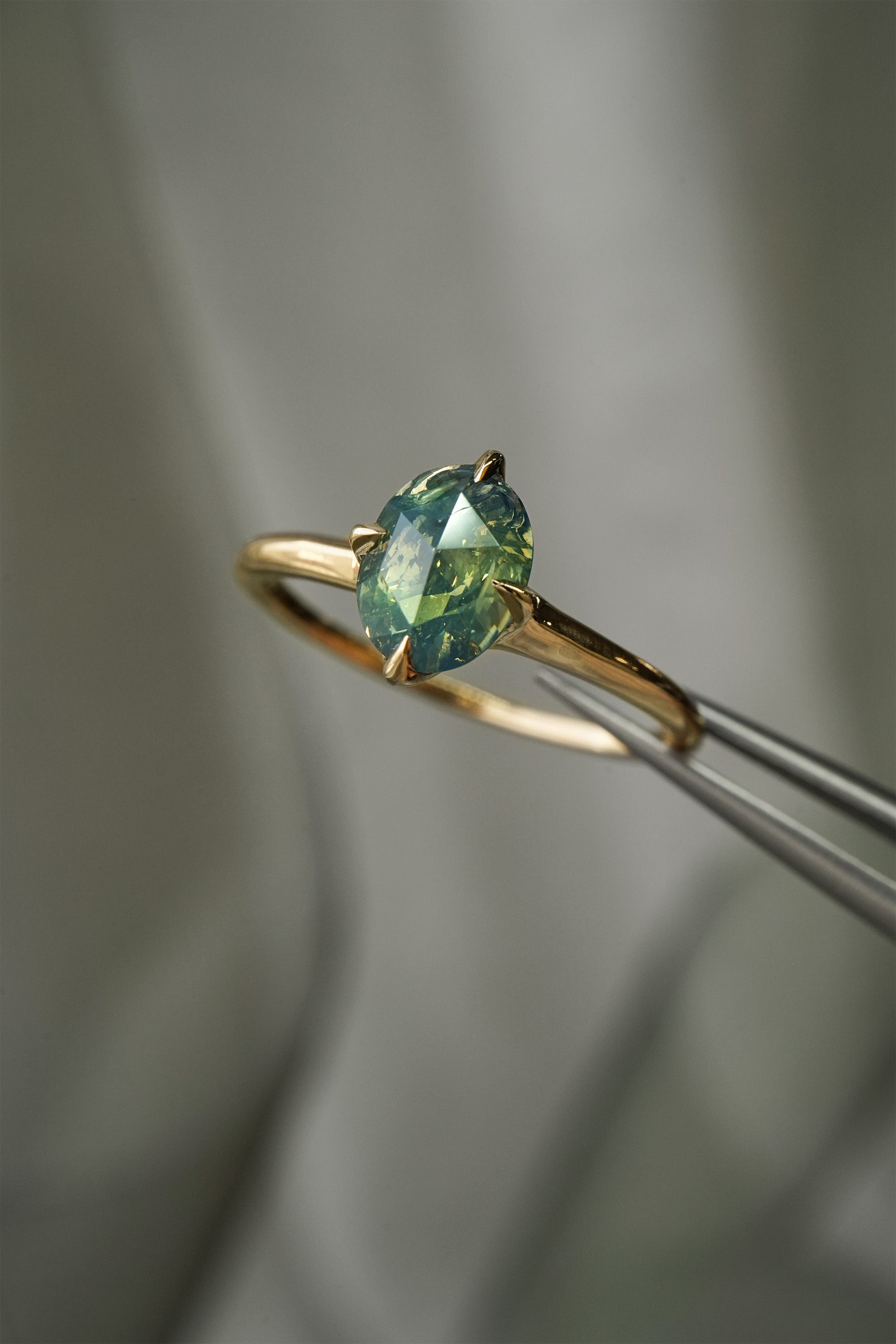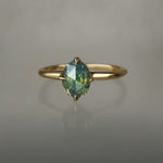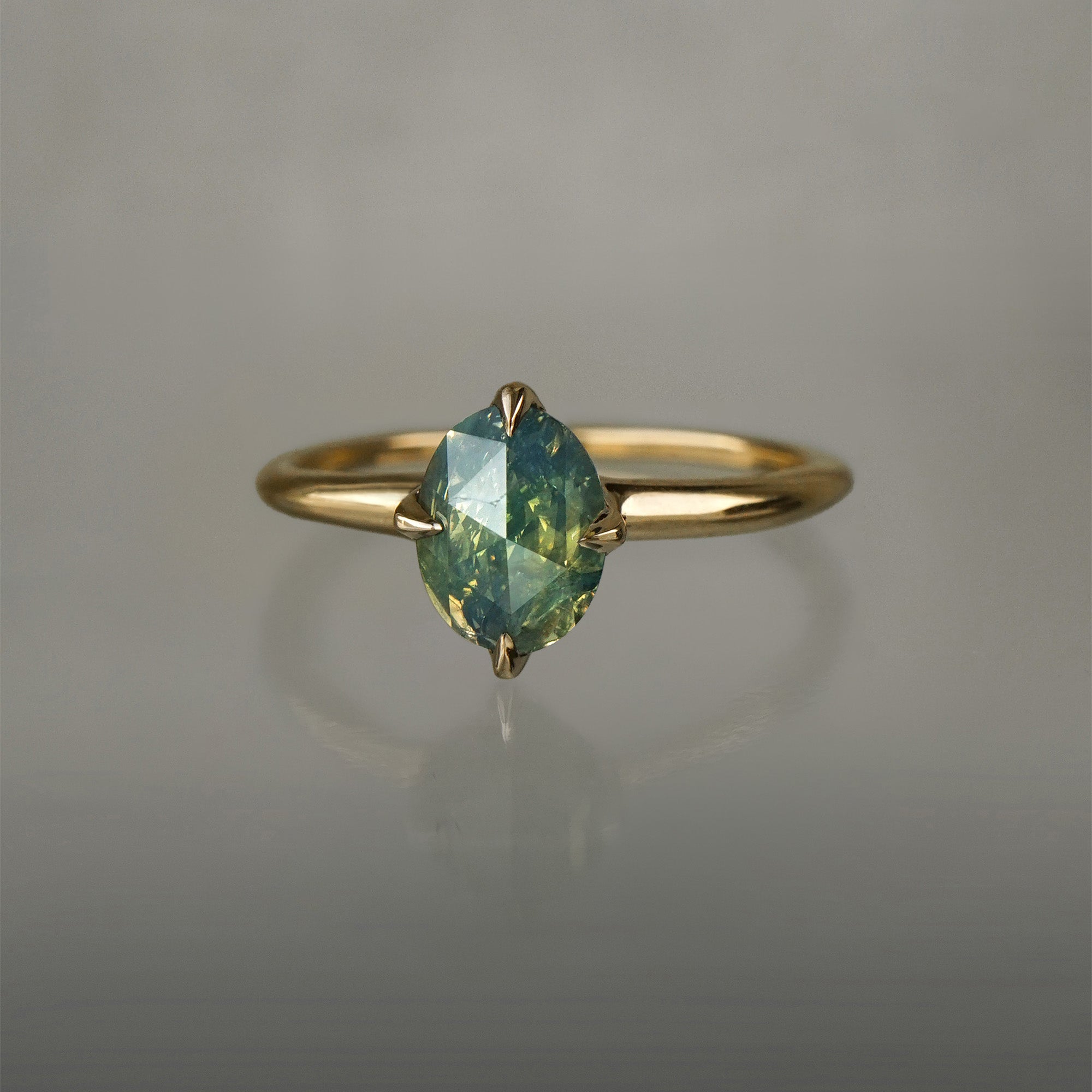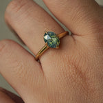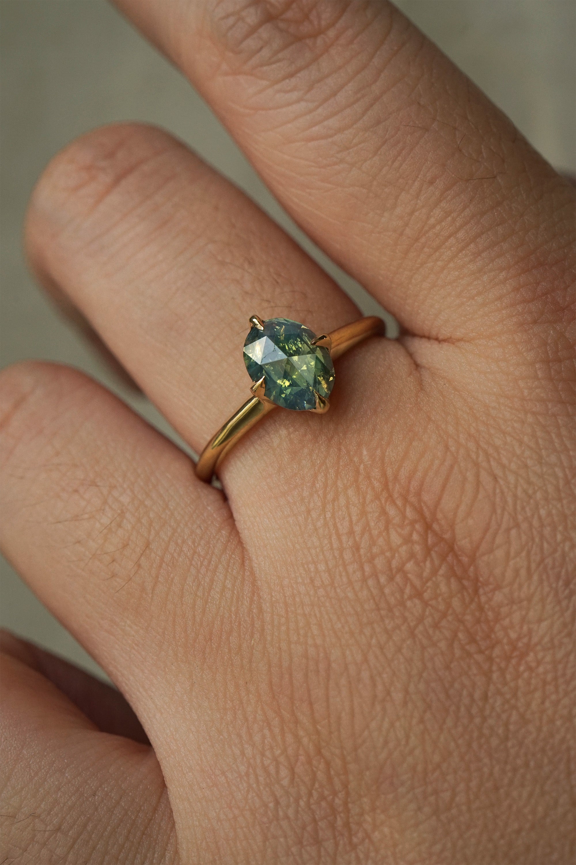1.10ct opalescent turquoise sapphire with yellow glow in an oval rose cut, measuring 7.82 x 5.94 mm. This stone has visible inclusions; please see the description for more details. Beneath the sapphire, there is a hidden 0.17ct marquise cut natural diamond, giving the sapphire incredible sparkle.