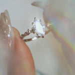 Nymph of the frozen winter lake, with a sweet but arcane charm about her. Slivers of light shine from her gently curved marquise centre, punctuated with soft rose cut diamonds and petite twinkling recycled brilliant diamonds, raising her up through the icy waves.