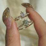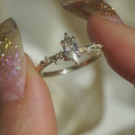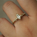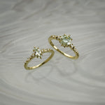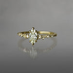 A guiding light, shining a path straight to your heart. The White Wisp with her dancing starlit diamonds, pointing towards a true centre and offering direction for lost souls. An elven marquise cut diamond with the spirit of the forest held tenderly at her centre; clutched in enchanted green gold, she is imbued with otherworldly, old-world magic.