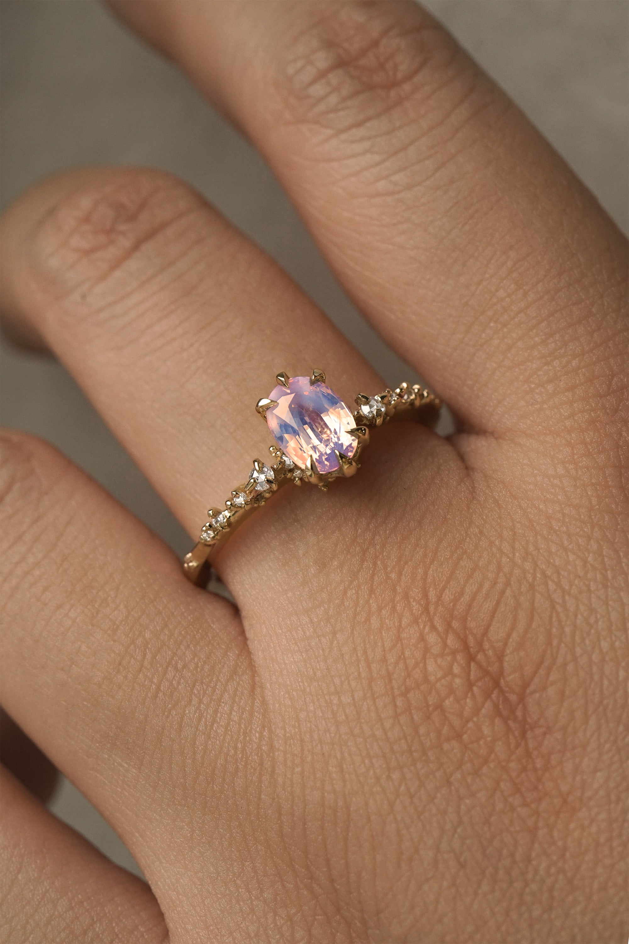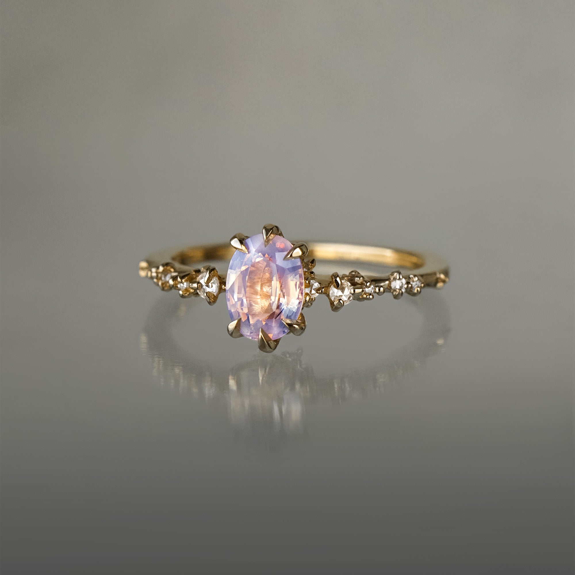 1.15ct oval cut opalescent sapphire, pale lavender with peach sparkle. The stone has a milky section and a blue freckle, with visible colour zones. Heavy silk gives an opalescent glow, and it measures 7.05 x 5.15 mm. Untreated.