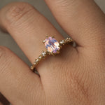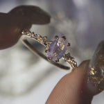 Nymph of the gentle dawn, with a sweet but arcane charm about her. Glowing with the colours of daybreak, she sparkles with peachy sunlight through lilac mist. She floats upon soft rose cut diamonds and petite twinkling recycled brilliant diamonds—droplets of dew.