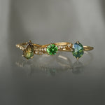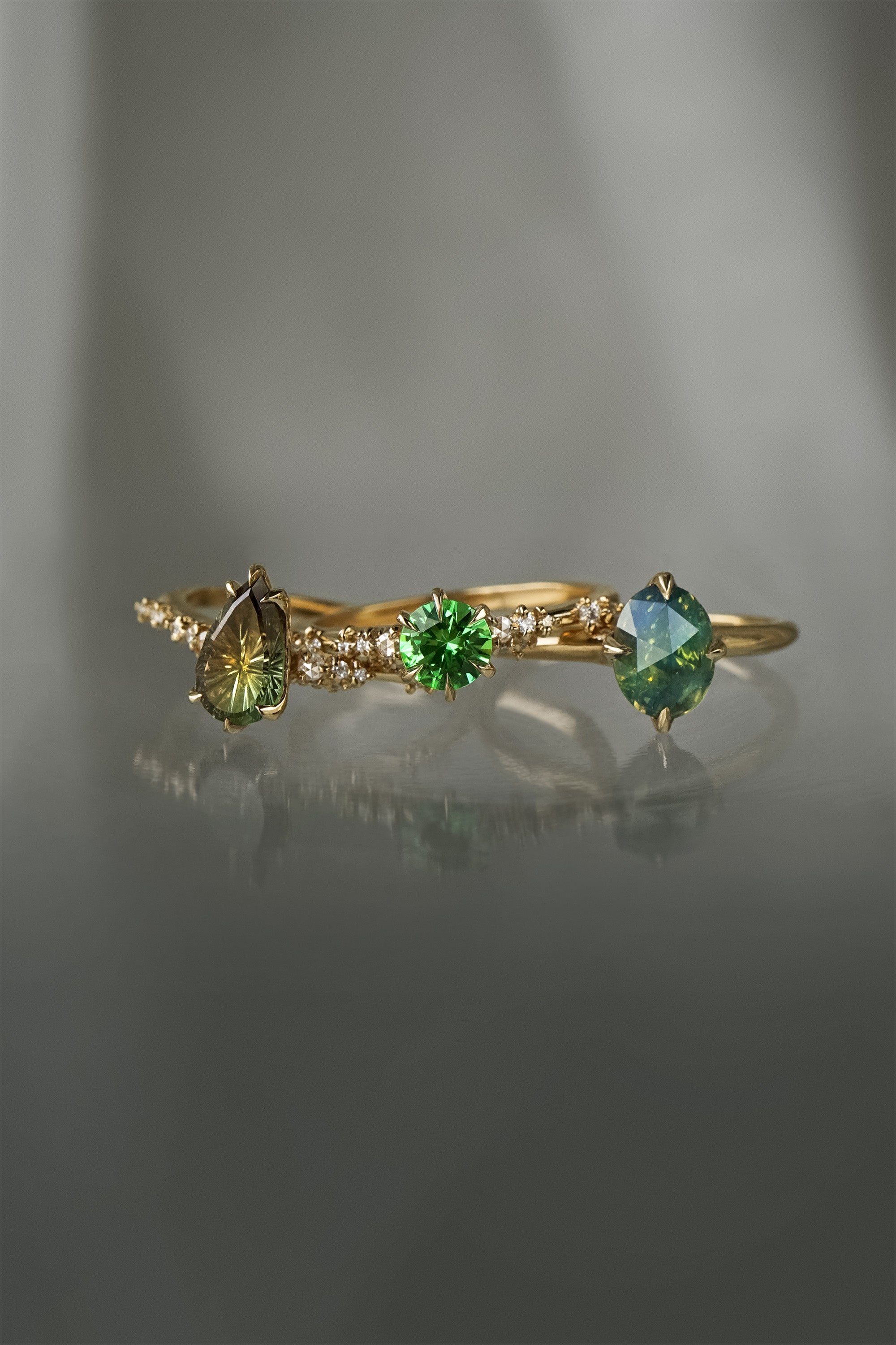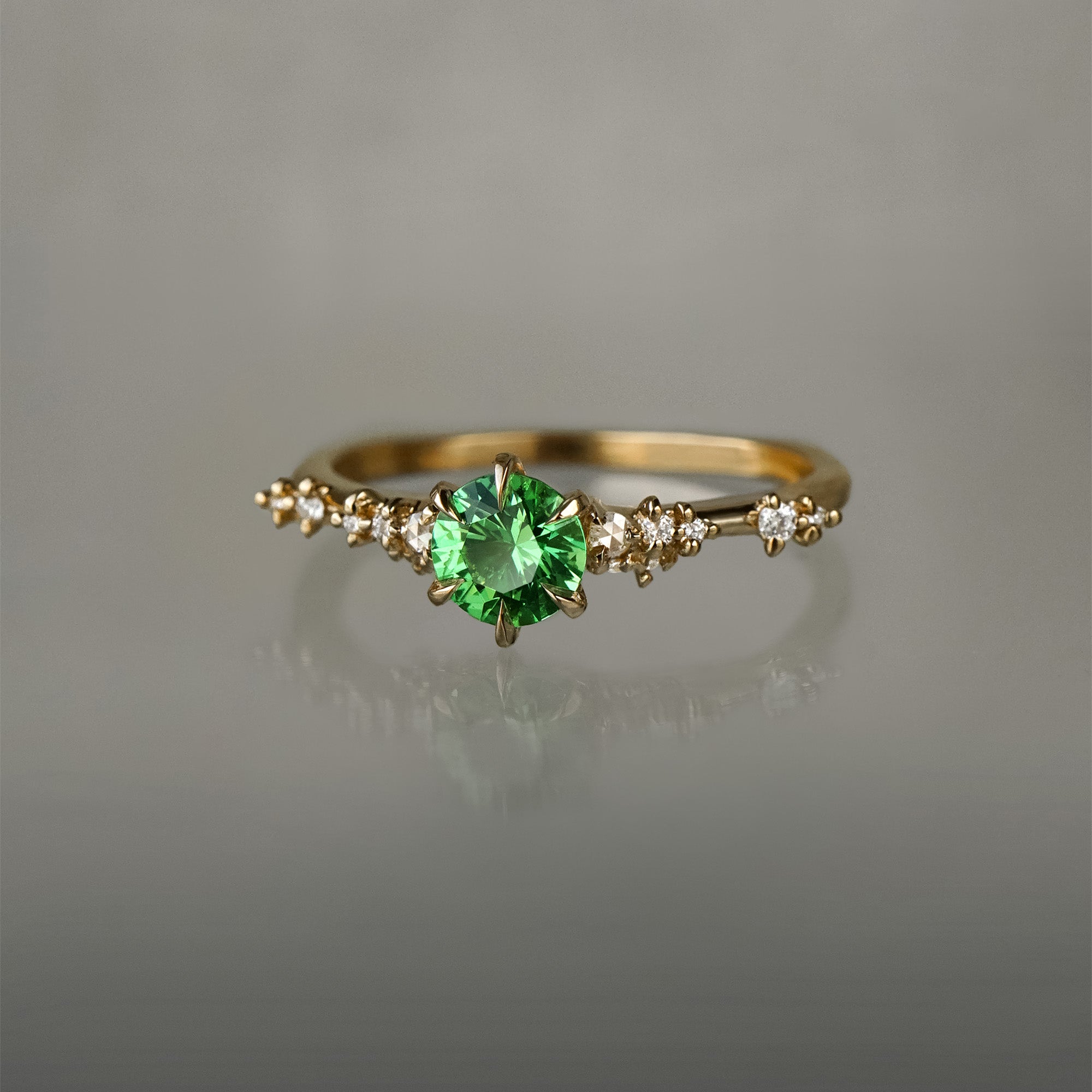 A spellbinding portal into the fae realm, glowing with otherworldly verdant tones. The scintillating diamonds of our Daphne wrapping around your finger with an ethereal, airy sparkle. Wildly delicate and finely finished, she is both complex and understated, with the tiniest of details. Made one-of-a-kind with sparkling, vibrant green tsavorite garnet.