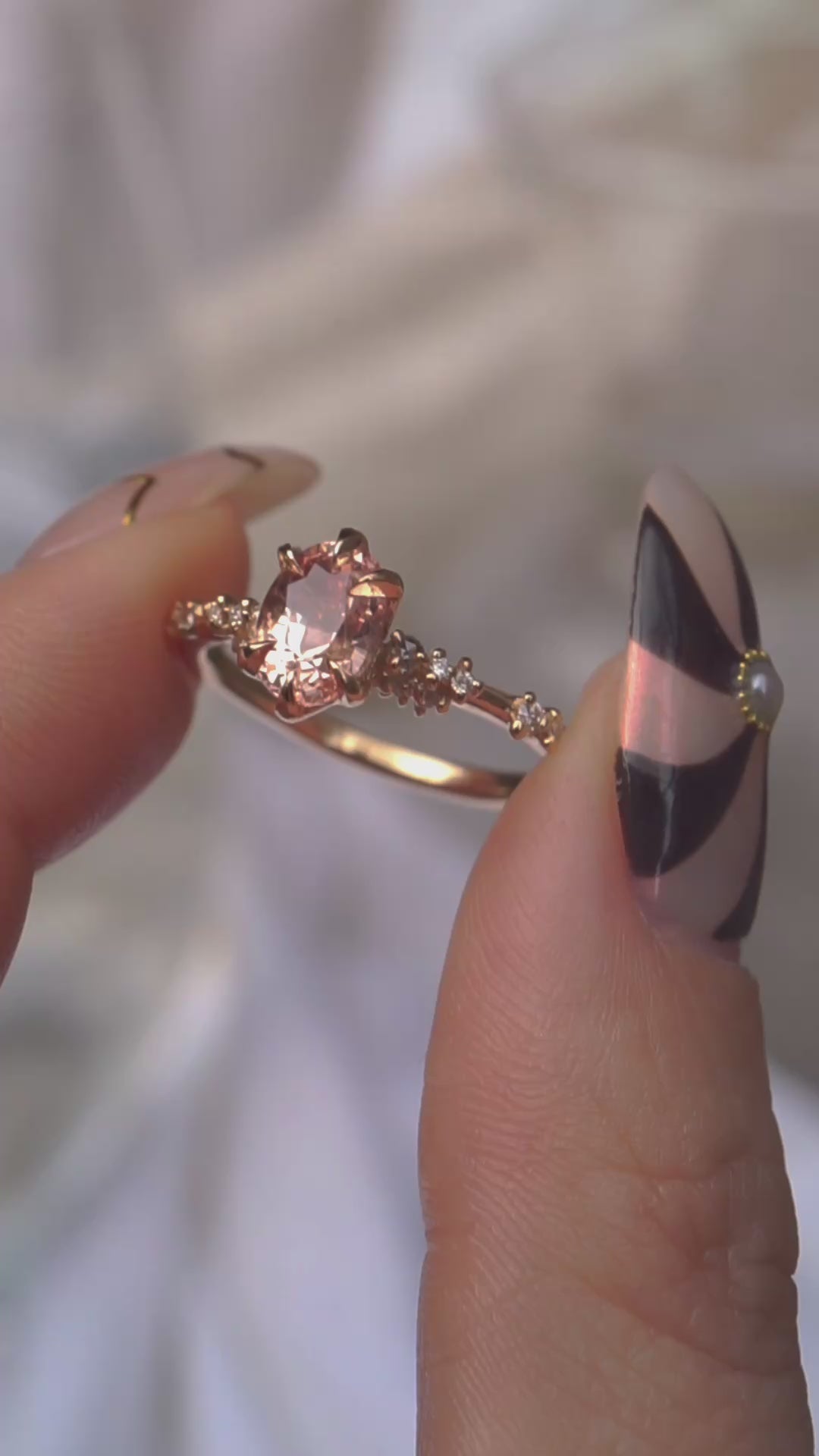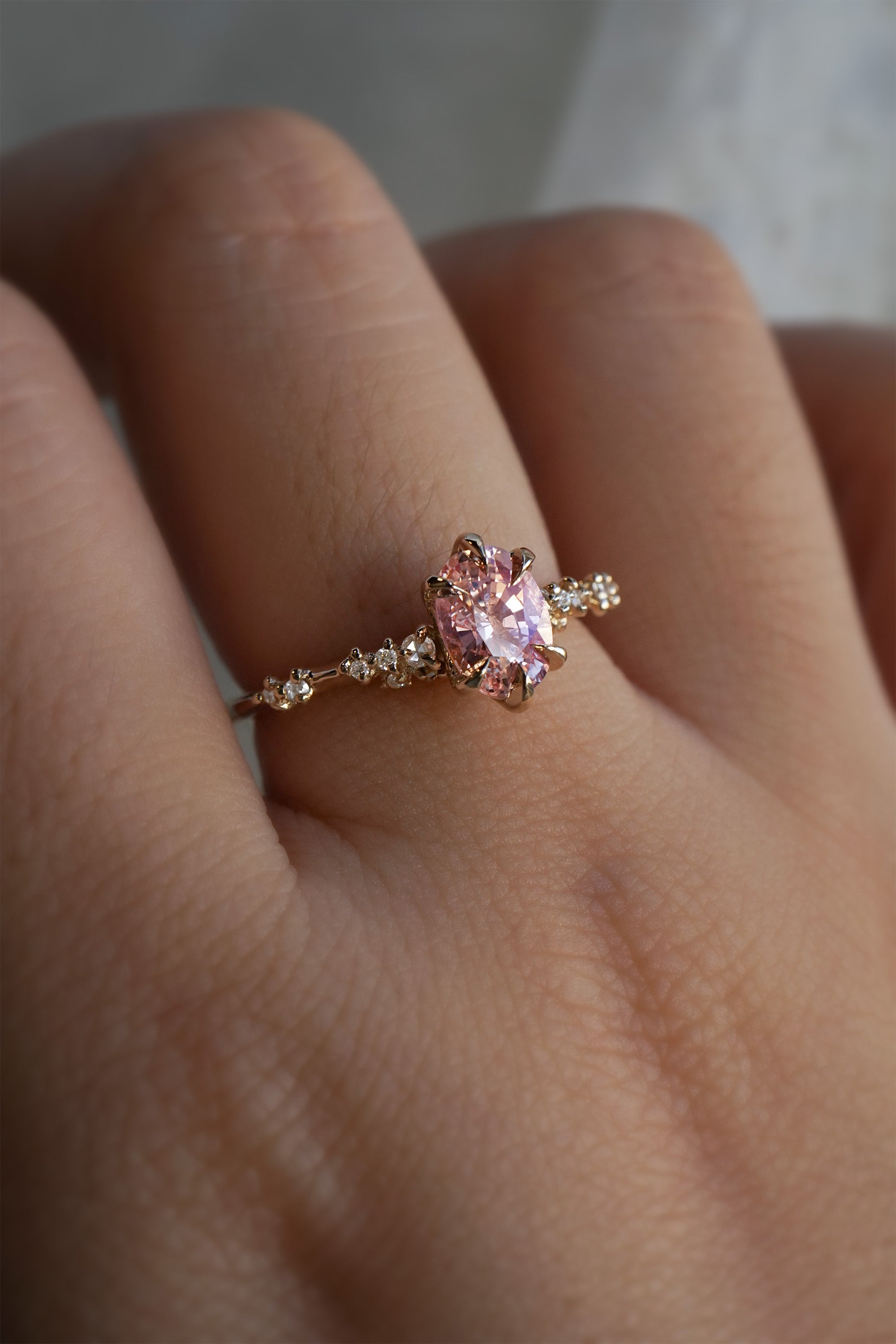 The soft hues of a sunset-coloured cloud floating in the late autumn sky, immortalized in this glittering peachy pink sapphire. With scintillating diamonds that wrap around your finger with an ethereal, airy sparkle. Wildly delicate and finely finished, Daphne is both complex and understated, with the tiniest of details. Made one-of-a-kind with an ethereal Padparadscha sapphire.