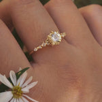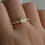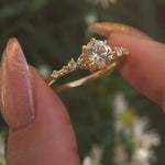 Nymph of the enchanted forest, with a sweet but arcane charm about her. Slivers of sunlight glide through her champagne yellow facets as she floats upon soft rose cut diamonds and petite twinkling recycled brilliant diamonds—droplets of crystallized dew.