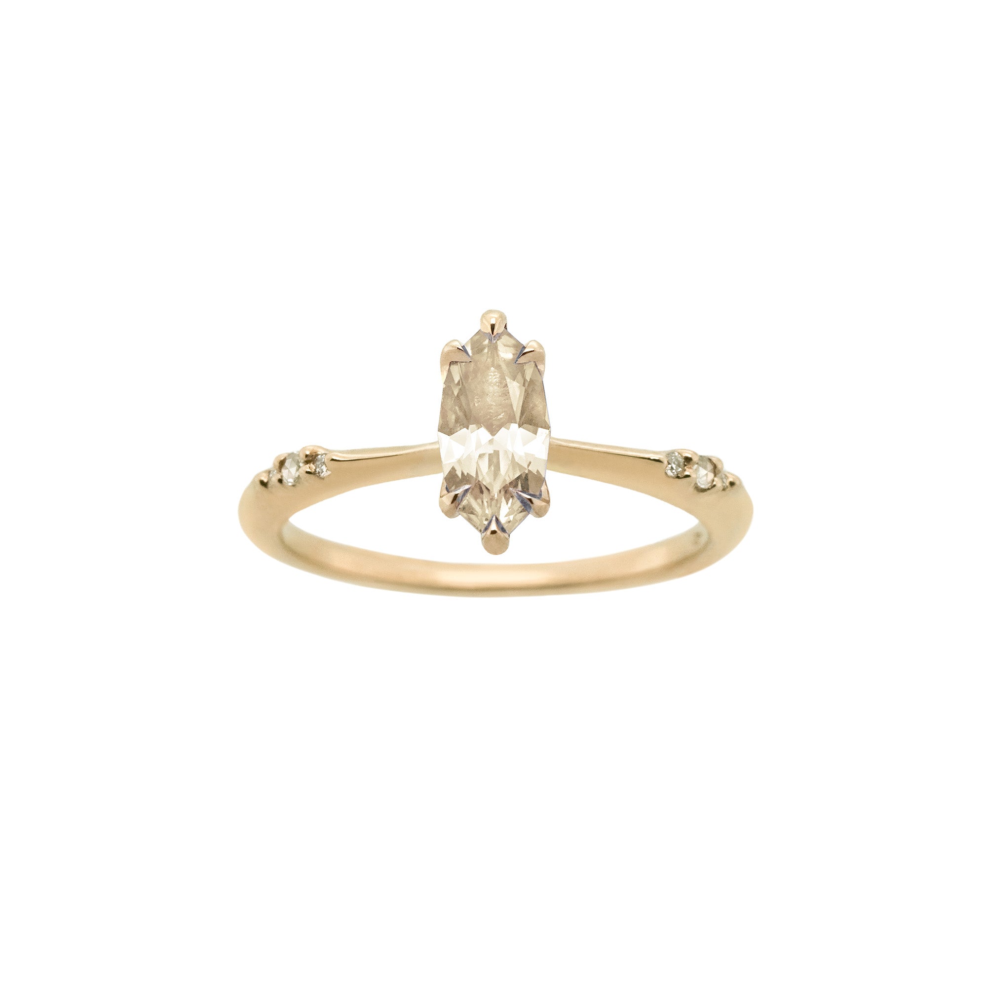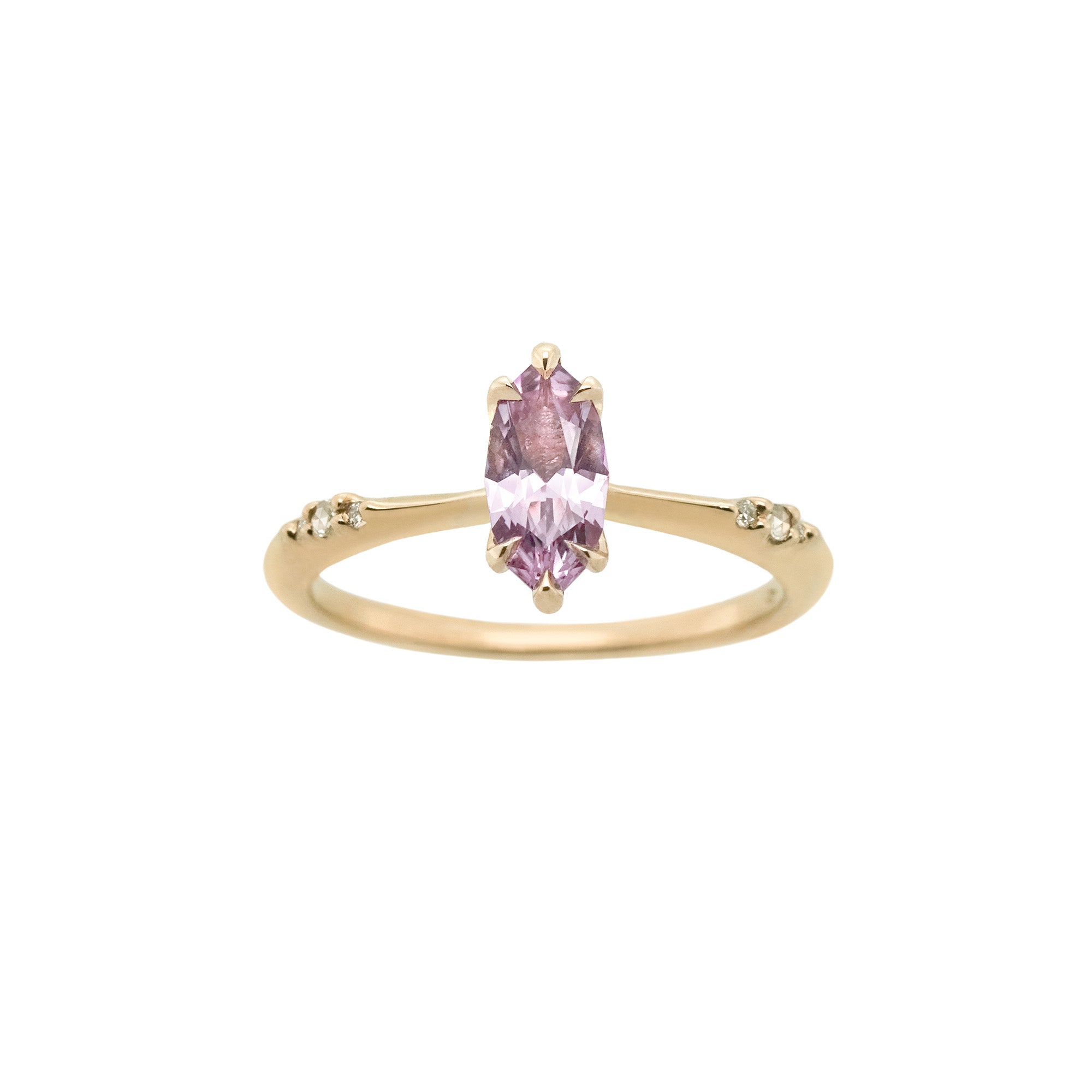 A spring petal frozen in time, with twinkling fairy lights floating down the band. Hand-carved with beautiful, bright 14k gold and the most petite hand-shaped claw prongs.