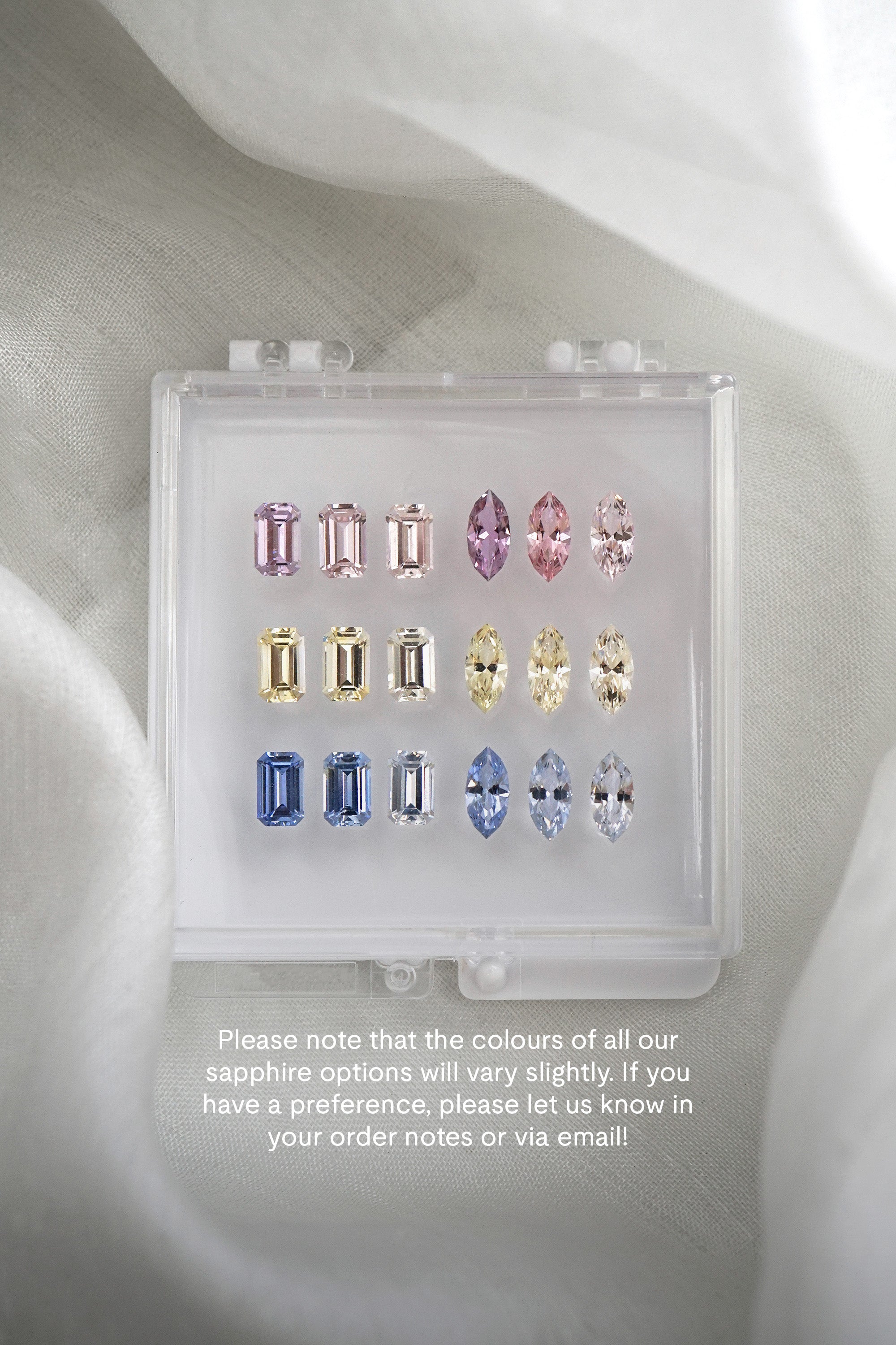 Sapphires are eye clean and heated, and colour may vary (might be slightly lighter or darker). Sapphire ratio (length and width) may vary slightly depending on availability.