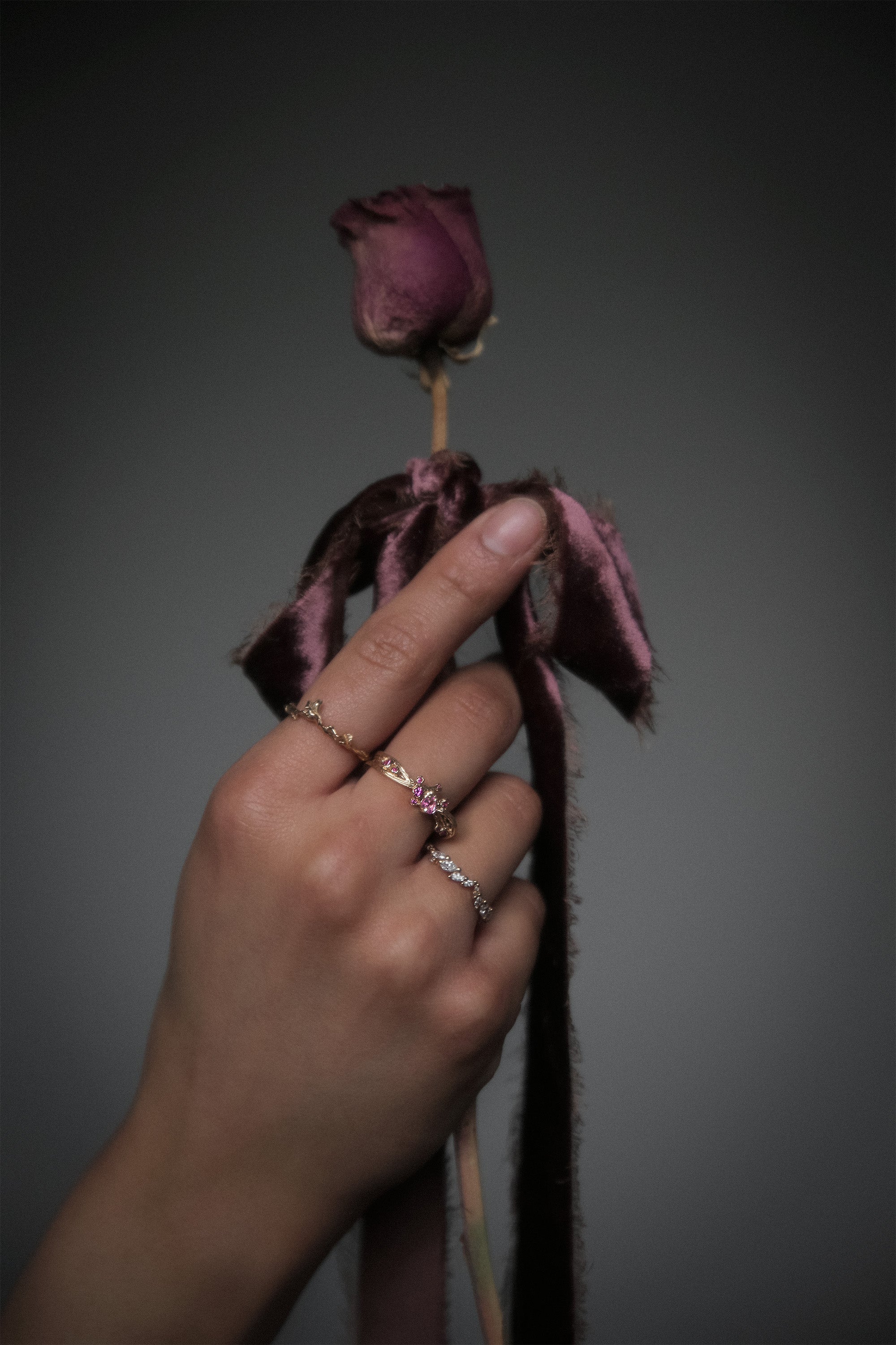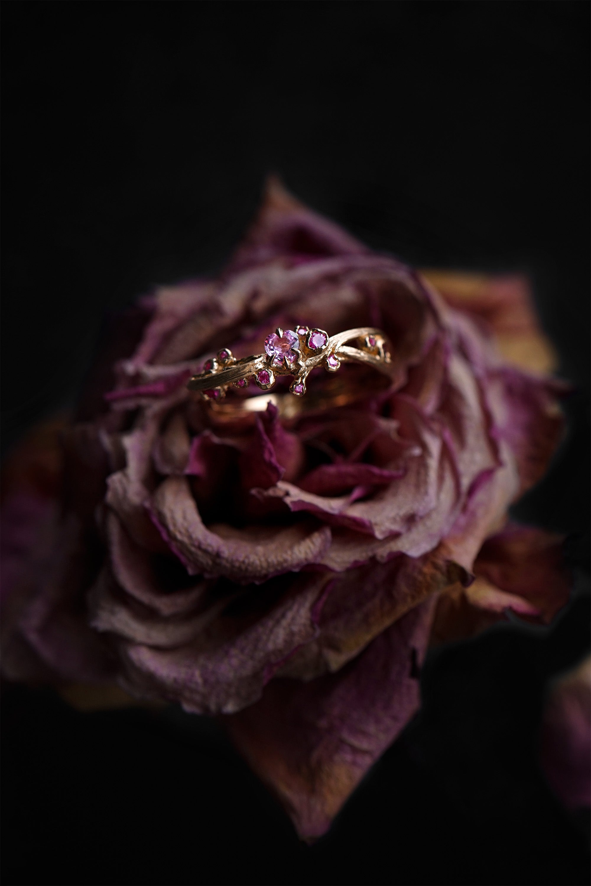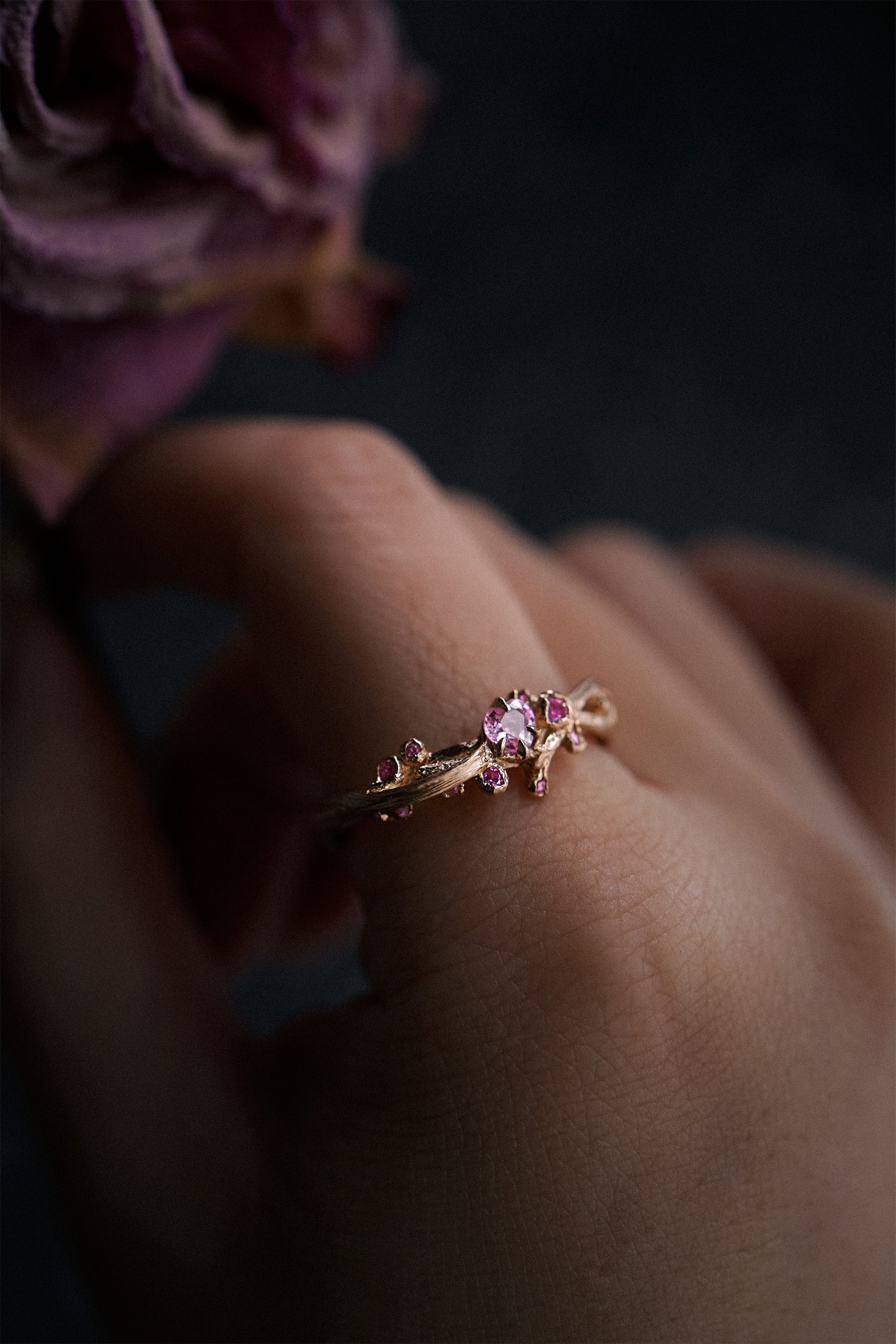 Softly brushed ribbons of gold, mirroring the curved silhouettes of the bleeding heart fleur, her lines reminiscent of art nouveau. A symbol of unconditional love, vining 'round your fingers. With a single ephemeral heart-shaped bloom clutched at her centre, laying in a sprinkling of your choice of gemstones—drops of pure romance.