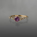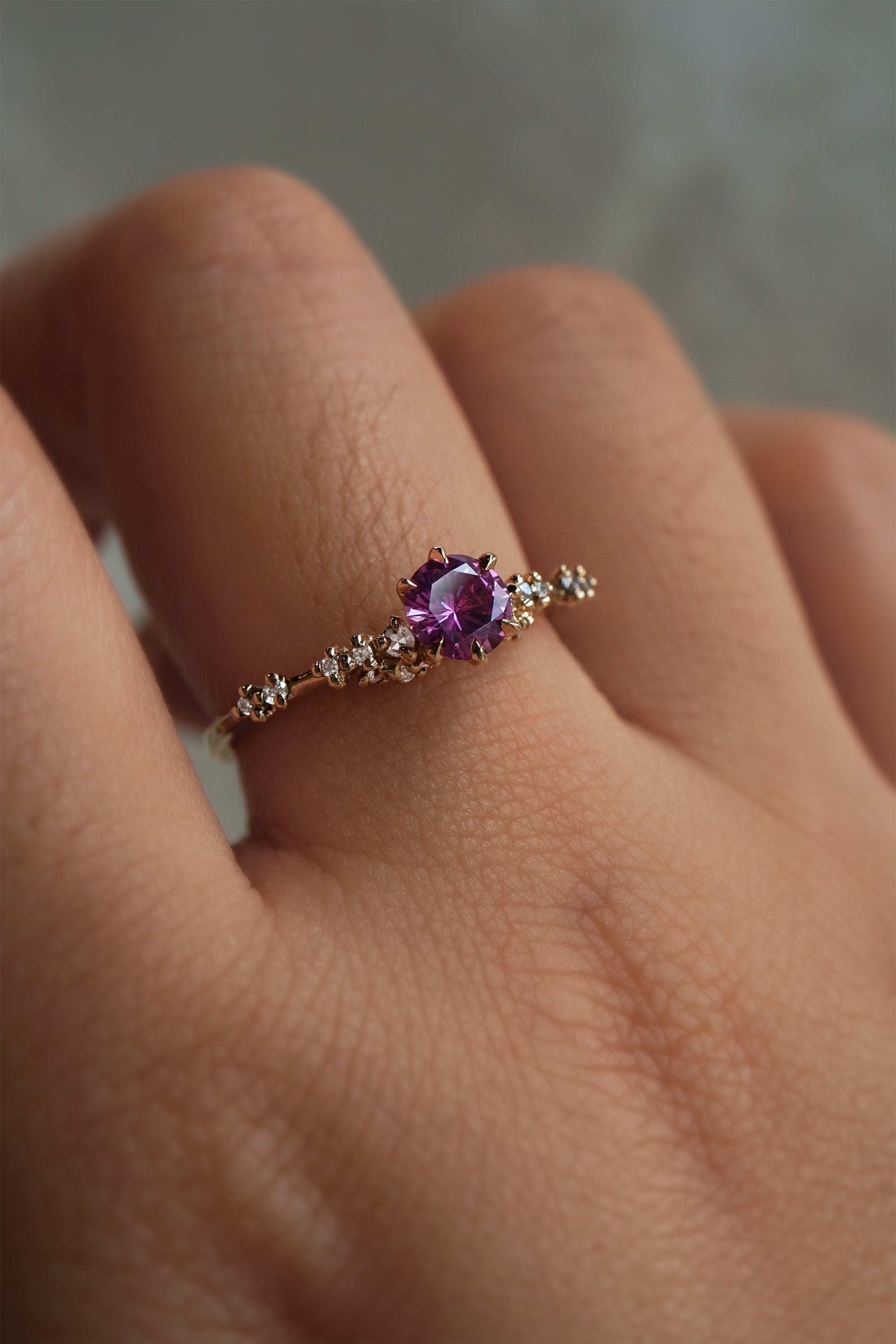 A half carat (5mm) round brilliant cut vibrant plum sapphire with red-violet hues. It has excellent clarity and is untreated.
