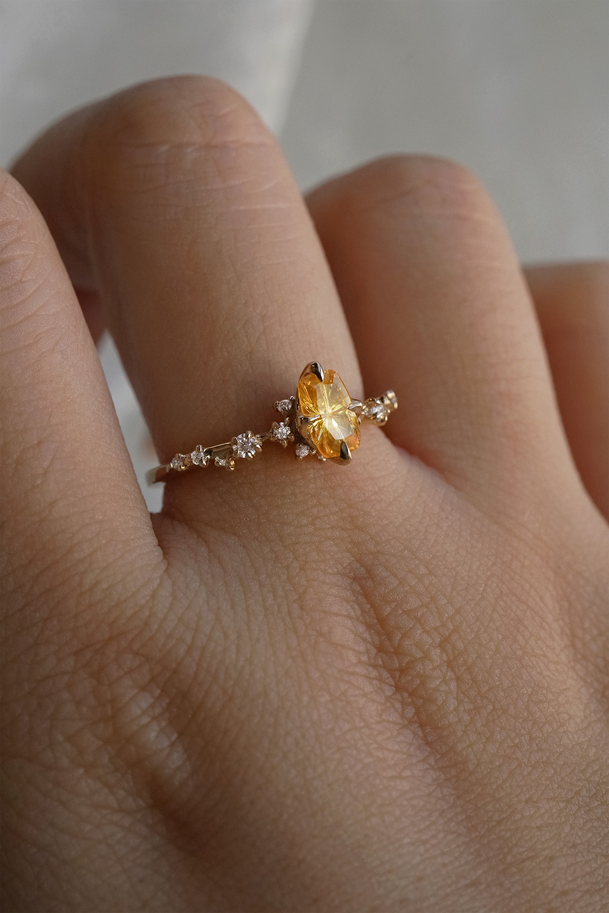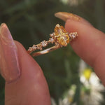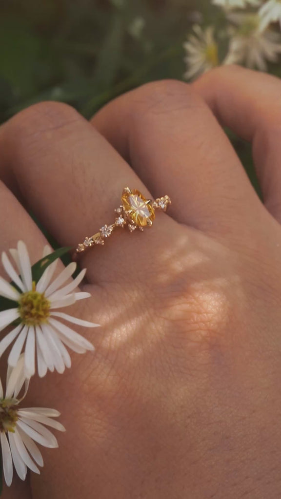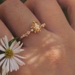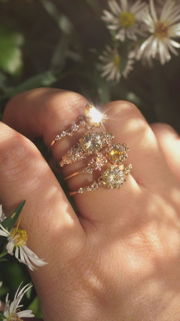 A guiding light, shining a path straight to your heart. The White Wisp with her dancing sunlit diamonds, pointing towards a true centre and offering direction for lost souls. A ray of warmest, brightest sun captured in her centre: a truly one of a kind golden yellow sapphire that glows with the warmth of summer's day past.