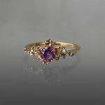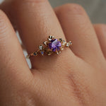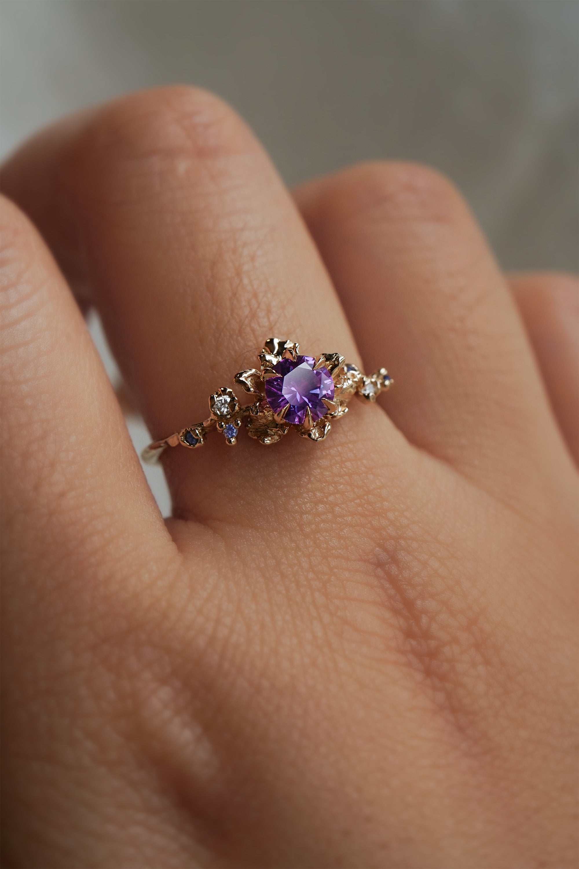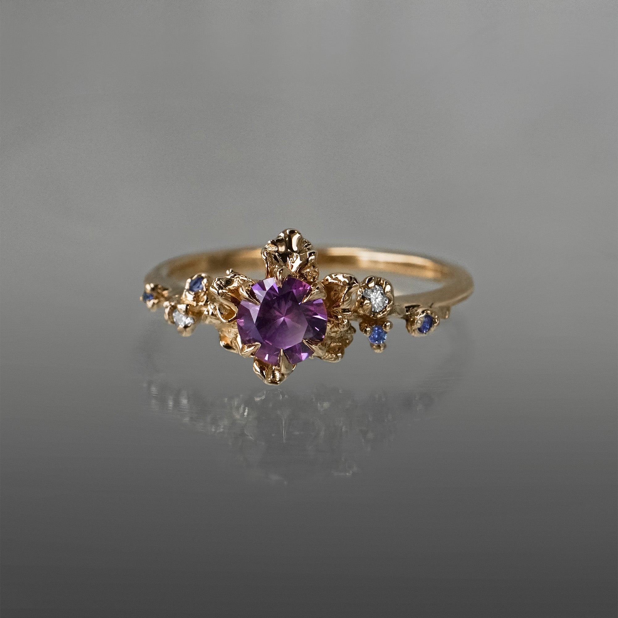 This one of a kind Asrai Garden ring is built on our Eos Circlet band, with a custom one of a kind iris flower setting. The band features a mix of blue sapphires and diamonds.