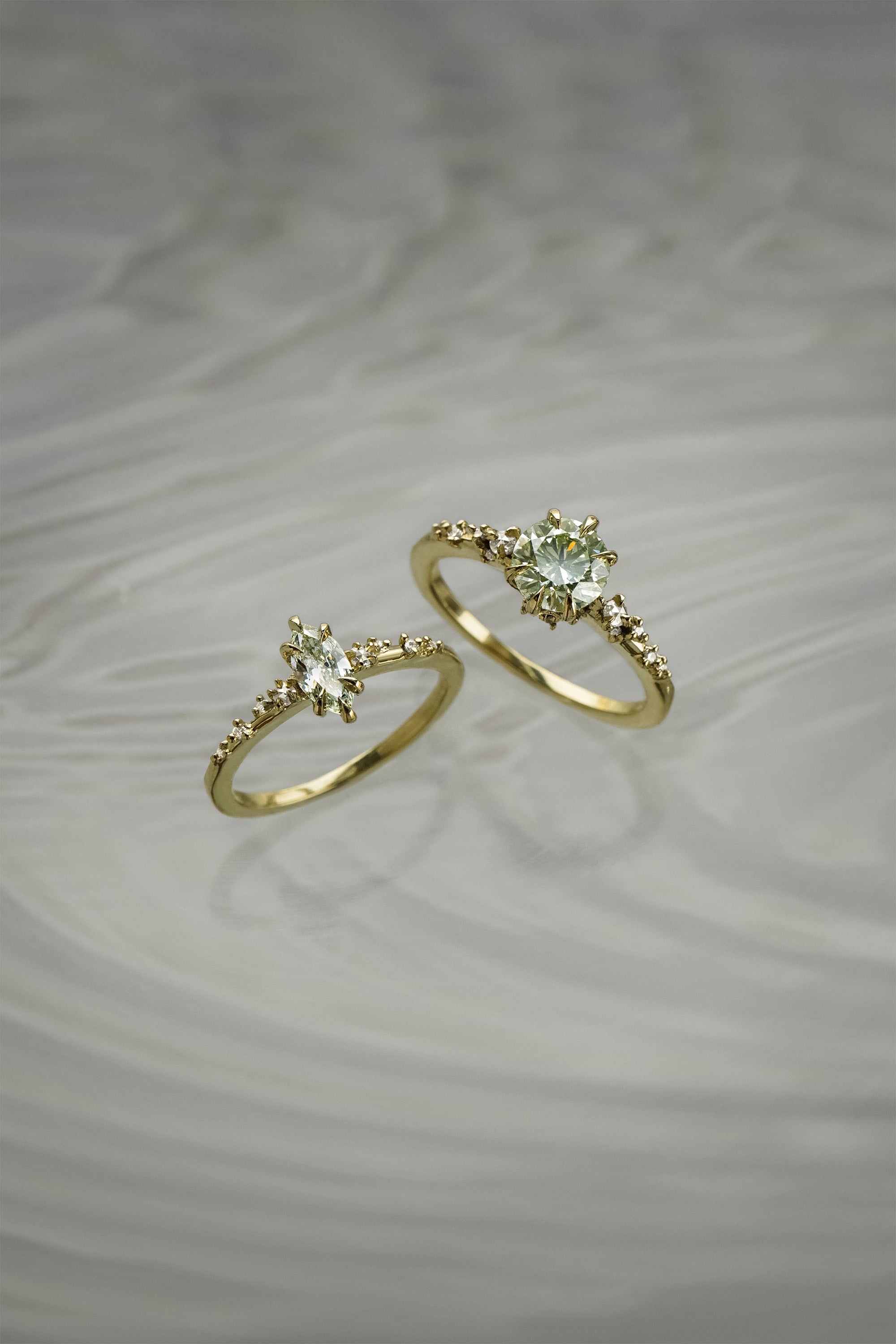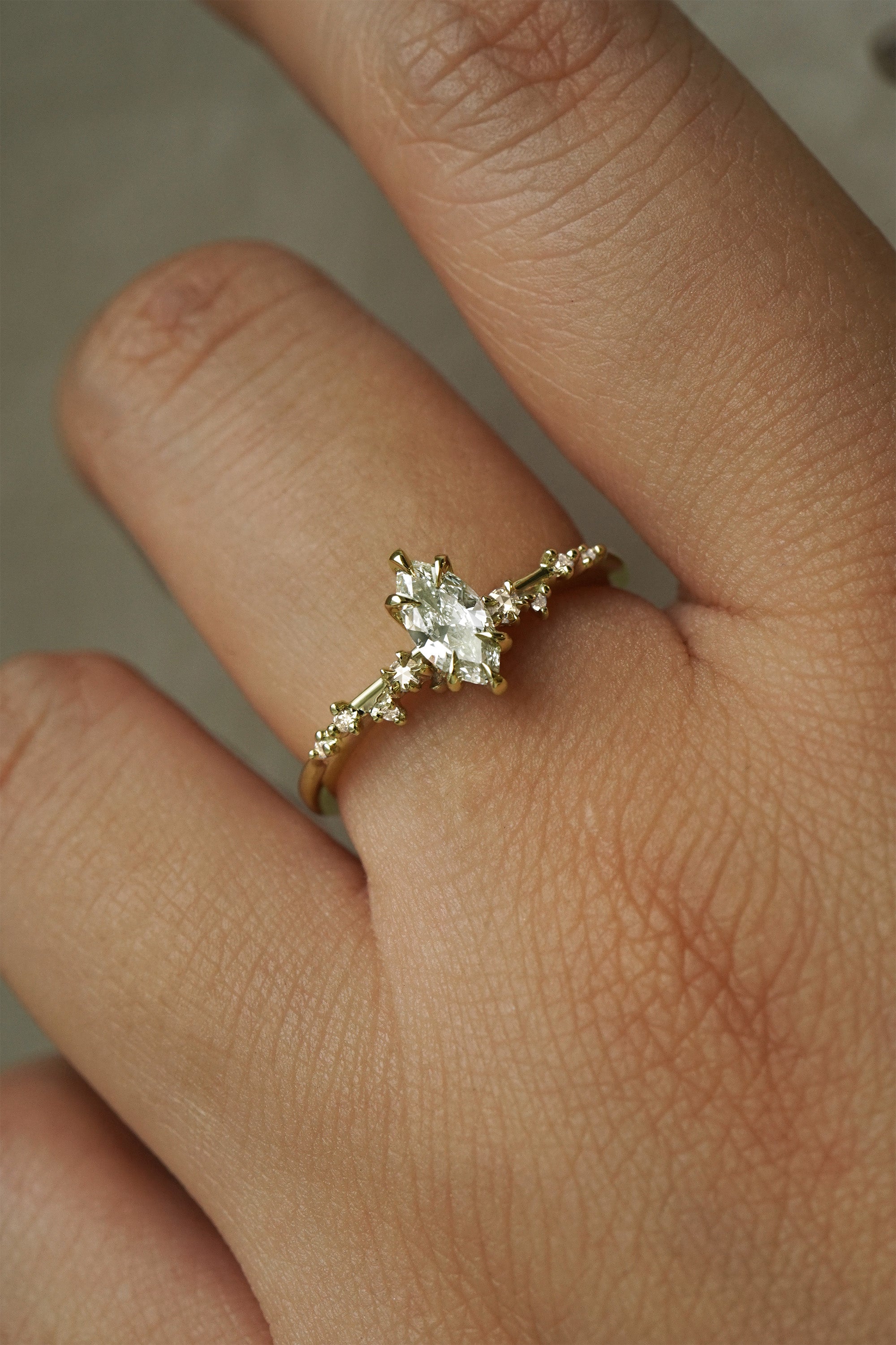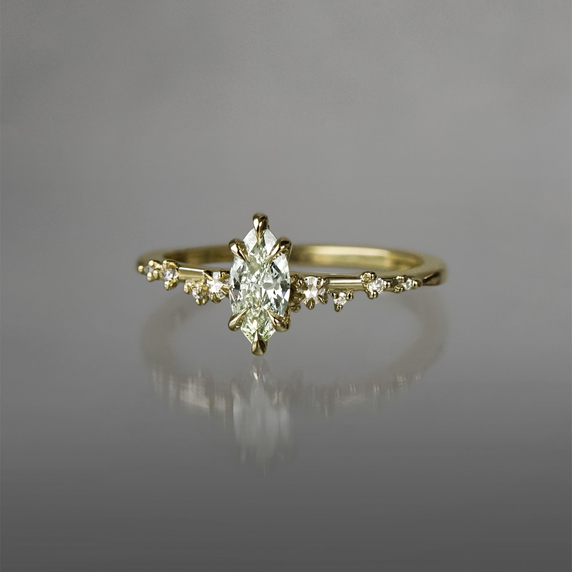 A guiding light, shining a path straight to your heart. The White Wisp with her dancing starlit diamonds, pointing towards a true centre and offering direction for lost souls. An elven marquise cut diamond with the spirit of the forest held tenderly at her centre; clutched in enchanted green gold, she is imbued with otherworldly, old-world magic.